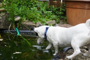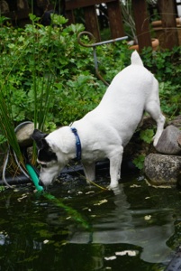 Am Anfang musste ich noch vieles kennen lernen. Den Teich im Garten mit den Goldfischen fand ich besonders toll. Aber Fische fangen scheint doch nicht so einfach zu sein. Habe mich voll bemüht, aber es gab kein Fisch, nur ein nasses Fell, bin nämlich in den Teich gefallen. Zum Glück war es an dem Tag sehr warm und Algen sollen ja gut für die Haut sein. Jetzt hab ich das Fischen aufgegeben. Beobachten ist auch ganz nett.