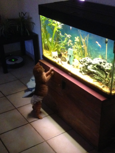 Das Aquarium ist wie Fernsehen für ihn. Er beobachtet lange und aufmerksam das Geschehen unter Wasser und versucht ab und ab mit der Tatze am Glas nach einem Fisch zu greifen.