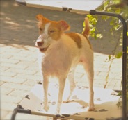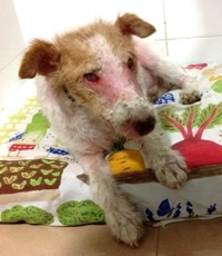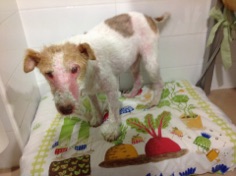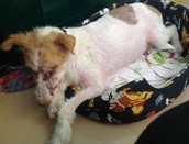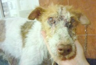So sah ich aus, als Anna und meine Retterinnen bei “Augen-Blick“e.V. um meine Aufnahme baten. Bis dahin hatte mich die nette Anna gepflegt. Mittlerweile war mir fast mein gesamtes Fell ausgefallen. Meine Haut darunter brannte schrecklich sobald die Sonne darauf fiel. Ebenso wund waren meine Füße. Die Frauen von Augenblick erschraken als sie mich so sahen. Ich zuckte bei jeder Berührung zusammen.