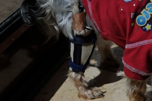 Ein paar Tage später kam die Minibandage per Post. Wir befestigten sie mit einem weichen Band über den Rücken (unsre eigene Erfindung schon bei der ersten Bandage… rein zur Sicherheit).