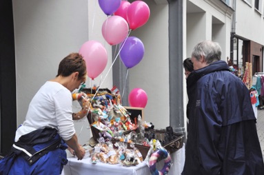In diesem Jahr haben zwei Vorstandsmitglieder unseres Vereins erstmalig am Koffermarkt in der Neustraße in Trier mitgemacht. Zum Kauf angeboten wurden von diesen in Eigenarbeit liebevoll hergestellte Handarbeiten verschiedenster Art. Den Koffer schmückten Lavendel-Säckchen, kleine Eulen und natürlich kleine Hunde aus Stoff, die gut als Anhänger zu gebrauchen sind. Kleine Nadelfilzarbeiten vom Marienkäfer bis zur Pinguinfamilie gefielen den Besuchern des Koffermarkts sehr gut. Auch kunstvoll geschliffene Gläser mit den wundervollen Motiven fanden in dem Koffer ihren Platz und suchten nach neuen Besitzern.